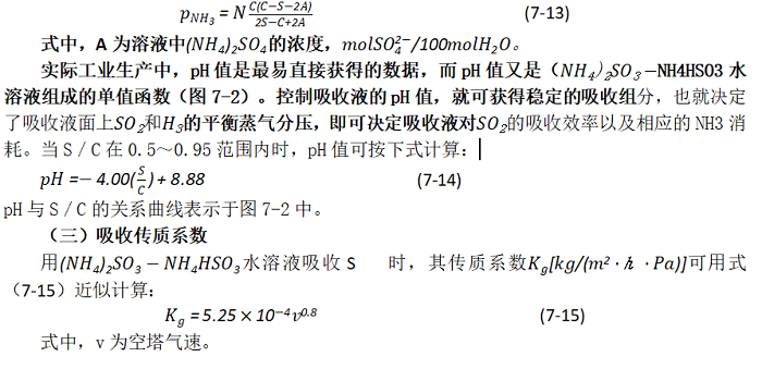 在通入氨量較少時,發(fā)生式(7-1)反應(yīng),在通入氨量較多時發(fā)生式(7-2)反應(yīng),而式(7-3)表示的才是氨法中真正的吸收反應(yīng)。在吸收過程中所生成的酸式鹽NH4HSO3對SO2不具有吸收能力,隨吸收過程的進(jìn)行,吸收液中的NH4HSO。數(shù)量增多,吸收液吸收能力下降,此時需向吸收液中補充氨,使部分NH4HSO3轉(zhuǎn)變?yōu)?NH4)2SO3,以保持吸收液的吸收能力。