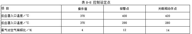(2)氨儲存供應(yīng)系統(tǒng) 計量的氨氣可依溫度和壓力修正系數(shù)進(jìn)行修正。從煙氣側(cè)所獲得的no,信號饋入有計算所需氨氣流量的功能??刂破骼冒睔饬髁靠刂扑璋睔?,使摩爾比維持固定。氦氣供應(yīng)管線上有一個緊急關(guān)斷裝置,當(dāng)入口煙氣溫度過低、過高或氨空氣稀釋比過高時,均與該裝置連鎖,迅速關(guān)斷,以確保操作安全和防止催化劑損壞。最初設(shè)定點見表8-8。