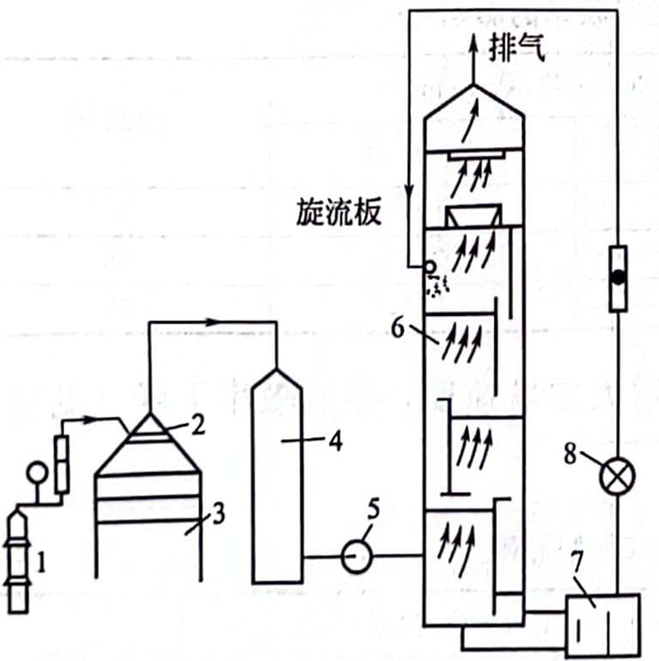 1-液氨鋼瓶;2-氨分布器;3一通風柜;4-緩沖瓶;5-風機;6-吸收塔;7一堿液循環(huán)槽;8-堿泵