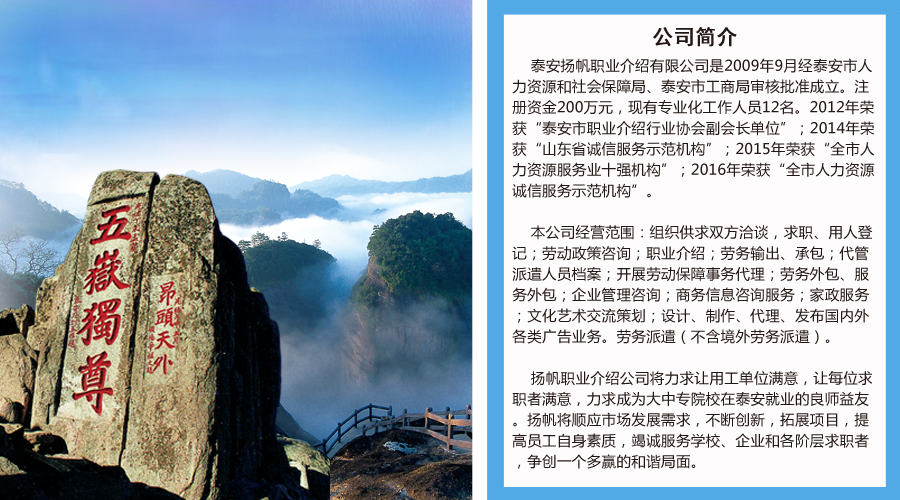 泰安揚帆職業介紹有限公司是2009年9月經泰安市人力資源和社會保障局、泰安市工商局審核批準成立。注冊資金200萬元,現有專業化工作人員12名。2012年榮獲“泰安市職業介紹行業協會副會長單位”;2014年榮獲“山東省誠信服務示范機構”;2015年榮獲“全市人力資源服務業十強機構”;2016年榮獲“全市人力資源誠信服務示范機構”。